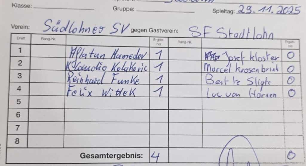 Damit steht unsere Zweite aktuell -gemeinsam mit dem SC Falke Saerbeck II – mit 0 Mannschaftspunkten am Tabellenende. Tröstlich dabei ist, dass man in den ersten Runden gegen die drei stärksten Mannschaften der BOL gespielt hat. In den verbleibenden sechs Runden besteht also durchaus die Chance, gegen weniger starke Gegner die nötigen Punkte für den Klassenerhalt zu holen.