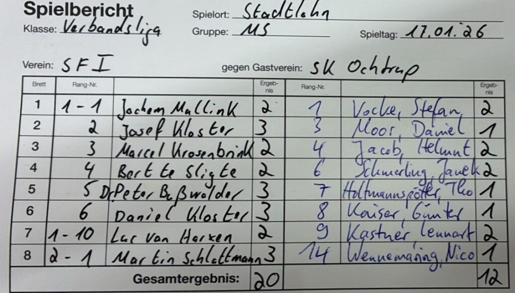 Unsere dritte Mannschaft empfing heute den SC Saerbeck III zur vierten Runde der Bezirksklasse, wobei parallel das Spiel unserer Ersten gegen den SK Ochtrup stattfand. Was die Spielstärke angeht, gab es natürlich einen riesigen Unterschied zwischen diesen beiden Matches. In Sachen Spannung lag unsere Dritte heute allerdings klar vorne 😉